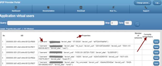 We also see "Properties" column. Here we can use in the same way as for peers. The difference is that this data stays saved after peer using VUser object closes session with super-node. You notice first property "Username". Because it is so common that peer-to-peer applications have username/password authentication, we explicitly embedded their use. Same stands for VNetwork "name" property. You can add other properties to your will. In special case if you don't need username/password authentication and you need to use permanent meta-data storage, you can just fix them in some way.